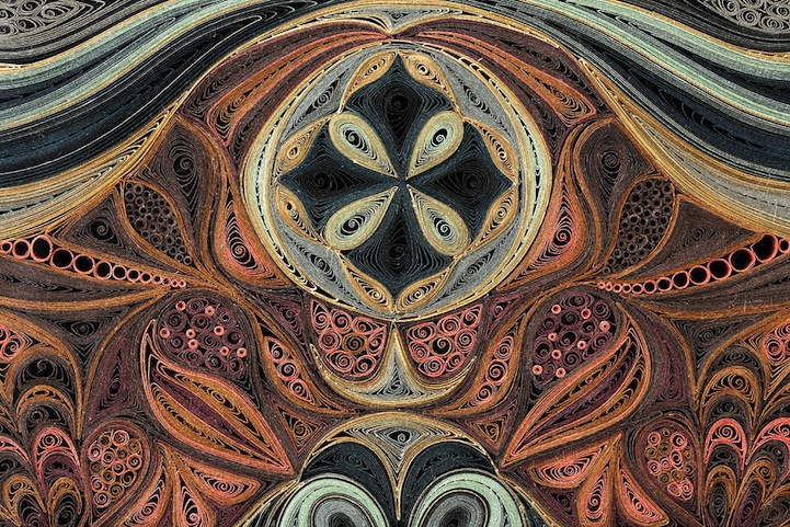 I have been working with a paper technique called quilling or paper filigree for about 5 years. I cut paper into 1/4″ strips, wind the strips into coils and and pinch them into the shapes I desire. Each shape is glued to it's neighbor and my piece grow from the center out, much like assembling a puzzle.