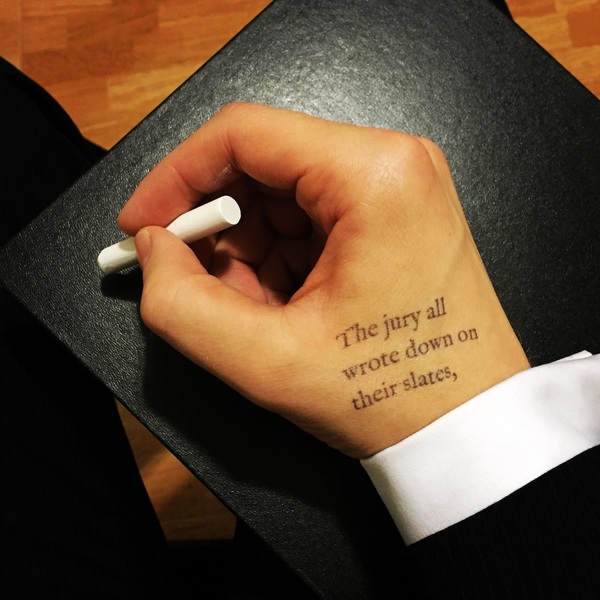 Backers were later encouraged to upload pictures of themselves wearing their designated phrase so viewers could read the entire narrative in tattoo form. Many decided to playfully interpret their given tattoo using props to explore its meaning. Others preferred to allow the tattoo to simply stand out on their bare skin. The entire, tattoo-based story can be read from beginning to end on Litographs.