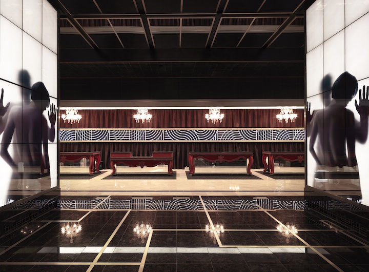 This evolving wallpaper blurs the line between interior design, graphic arts and animation. A bold and striking pattern of intersecting lines represents the many pathways a guest's journey can take at The Cosmopolitan.