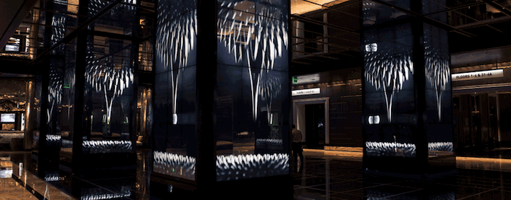 On my recent stay at the Cosmopolitan hotel in Las Vegas, I was taken aback by an incredibly cool experience in their lobby. Created by Digital Kitchen, the living art is made up of 8 columns, which have 12 individual screens on each side. Using a combination of photography, film, and 3D and 2D animation, Digital Kitchen presents several stories that are as beautiful as they are intriguing.