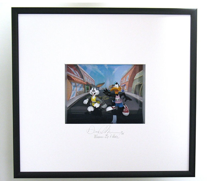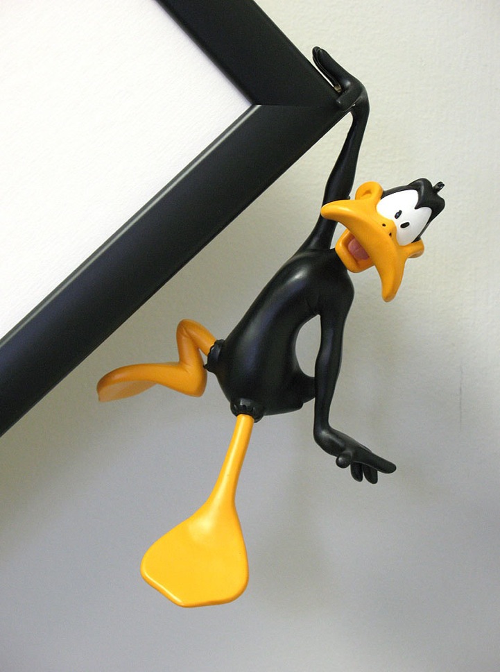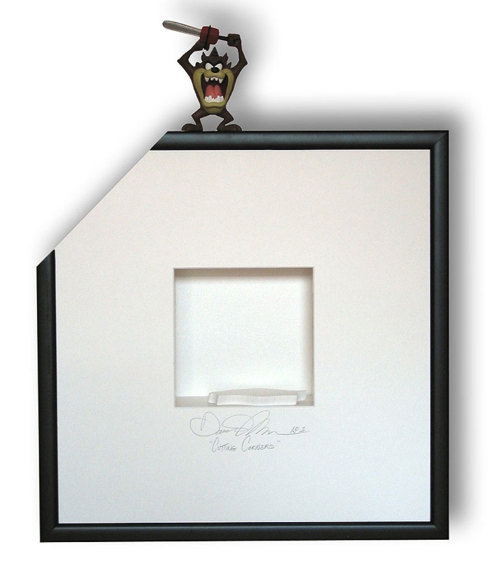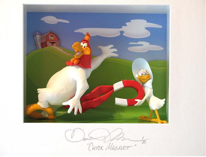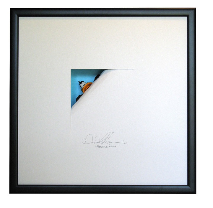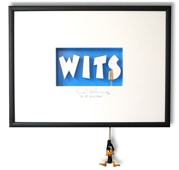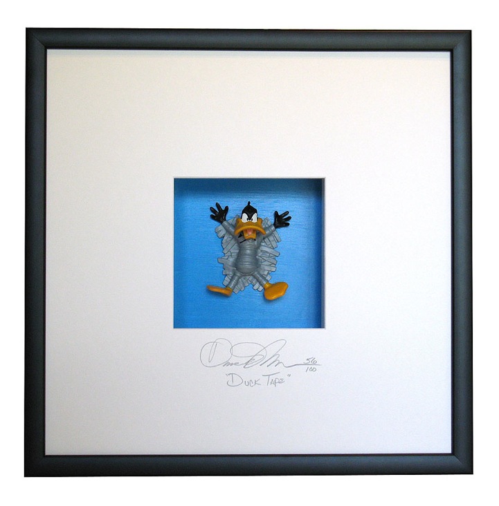 Each piece's intention is to translate a common phrase or figure of speech into its literal interpretation. Daffy Duck, one of my all-time favorite cartoon characters, is heavily featured in this series. He can be seen propped outside of a framed box, literally “thinking outside of the box,” or peeking from a corner which would make him a “peeking duck.” The play on words in the titles of these pieces are what make the works truly enjoyable.