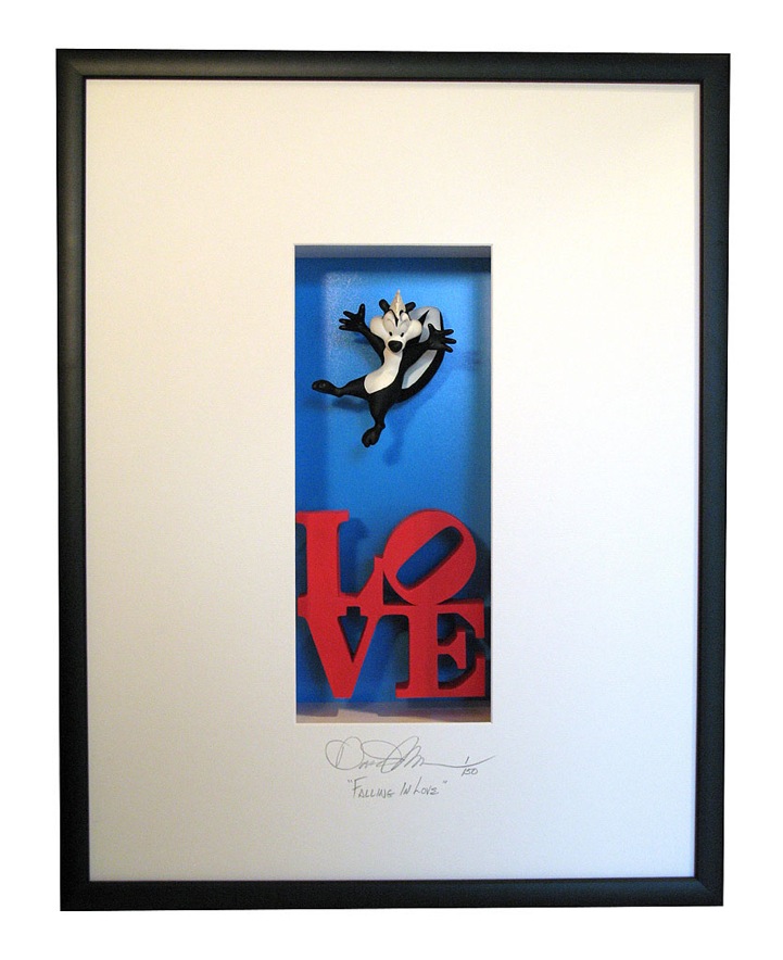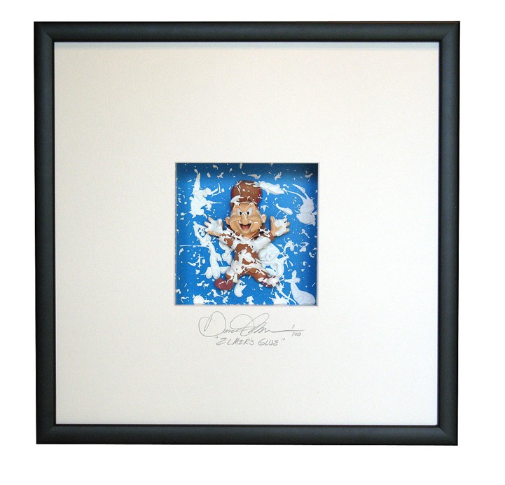 Kracov is an acclaimed artist with a long history of creating art inspired by children. He has worked on many classic animated films including The Lion King and The Swan Princess. In this series, Kracov has created shadow boxes featuring a comical display of cartoon figurines, which are positioned unconventionally. The shadow boxes are more of a prop than a frame for his works.