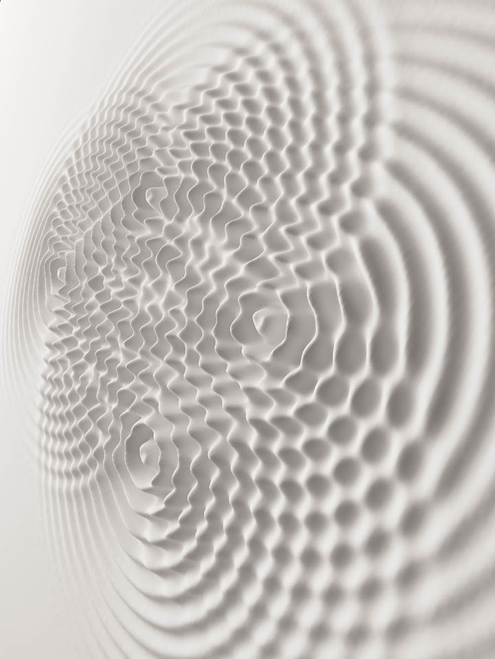 Each piece is first digitally produced and then fabricated with polyester resin before being seamlessly applied to a flat surface. This process and the materials allow for the waves to seemingly ripple and undulate across the walls fluidly. The series falls under his “extruding bodies” projects, as it is “a physical manifestation of a pulsation resembling a fluid’s whose balance has been disseminated to form a delicate electromagnetic wave. With these works, the context of the space is transformed and fragility is incorporated within the supporting structure as the artist simultaneously uses space as a subject and material, establishing at the same time new definitions of sculpture.”