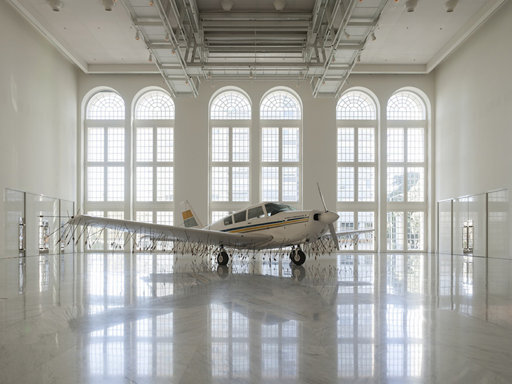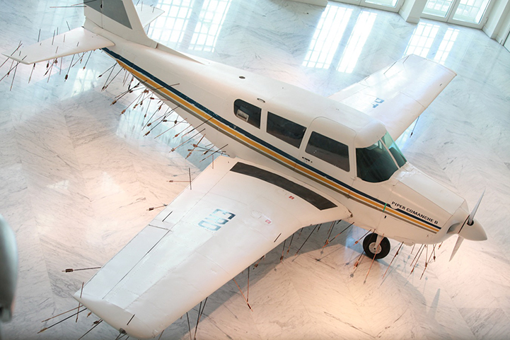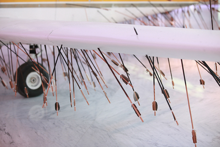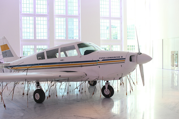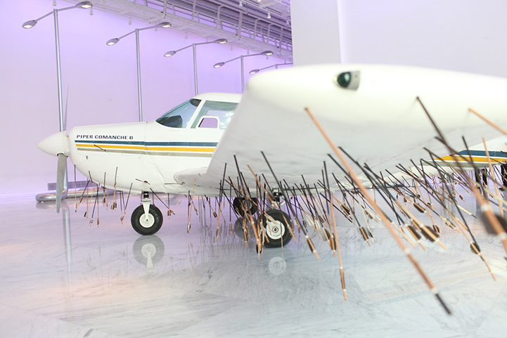 This airplane exhibit looks like it was attacked by hundreds of old-fashioned arrows and shot right out of the sky. The piece, entitled Avio, was developed by Havana-based creative collective Los Carpinteros (The Carpenters).
