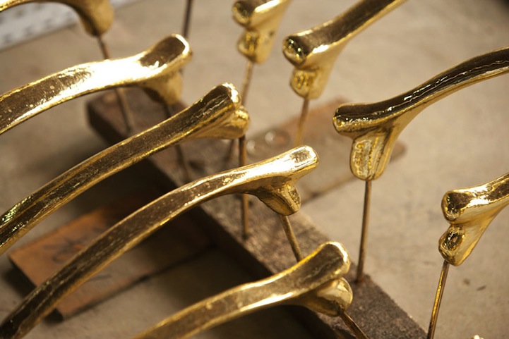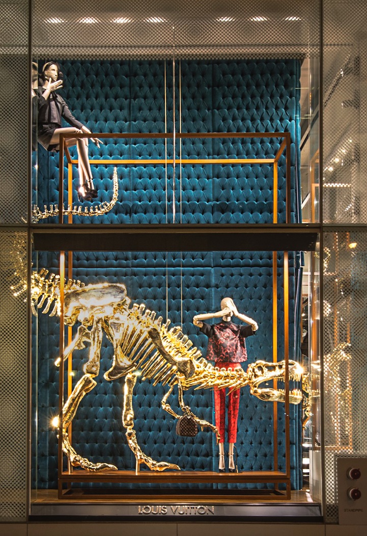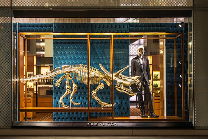The many store window displays in New York City often serve as both an incredible art exhibit as well as product advertisement. In this display by Louis Vuitton, fashionistas and history buffs alike will enjoy the trendy spectacle of gold dinosaur bones paired with the iconic new Pre-Fall/Winter 2013-2014 collection.