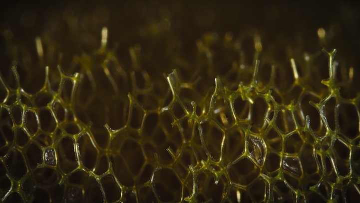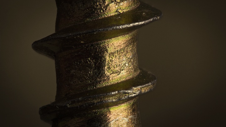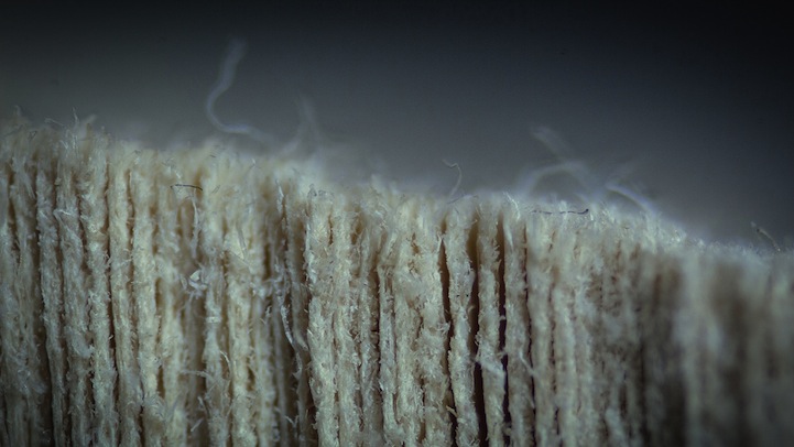 In his macro photo series Amazing Worlds Within Our World, artist Pyanek demonstrates the enormous complexity of everyday objects. Through the modified Canon T3i lens, squiggly fibers in book pages come into sharp focus, dramatic pit marks on the tip of a matchstick become visible, and beautiful green and gold streaks in the metal of a common screw jump out. To produce the images, the artist took multiple exposures with different focus points and stacked the frames, editing them in Adobe Lightroom and Exposure 5.