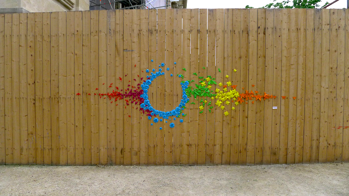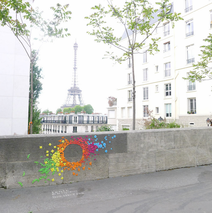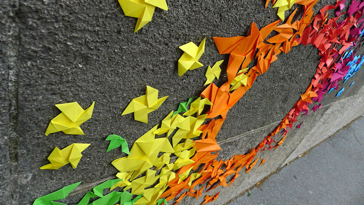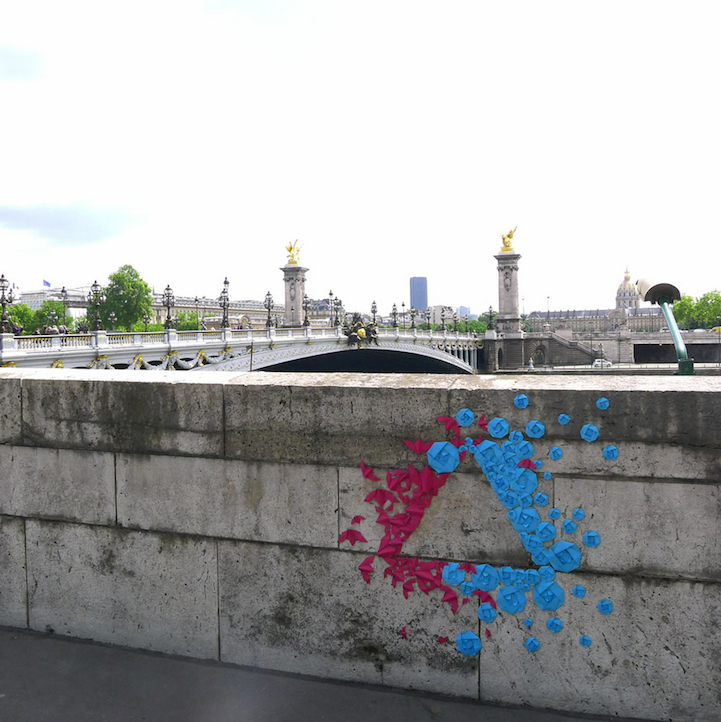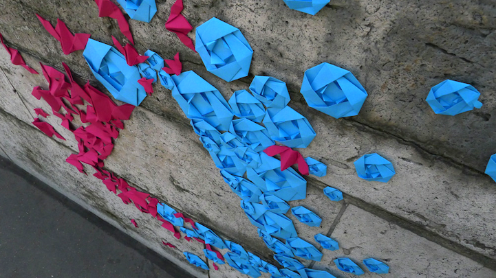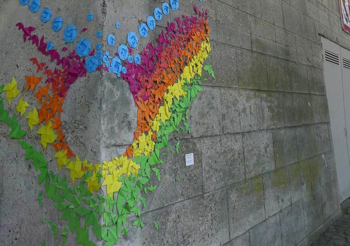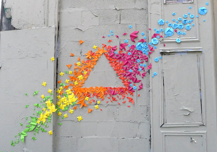 We have seen a lot of amazing paper artists recently and, in the past few months, we have also been inspired by many street artists around the world. Now, French artist Mademoiselle Maurice combines those two art forms into this unique rainbow origami street art. In these urban installations, Miss Maurice creates fantastic collections of geometric origami shapes and places them in patterns along the streets of Paris.