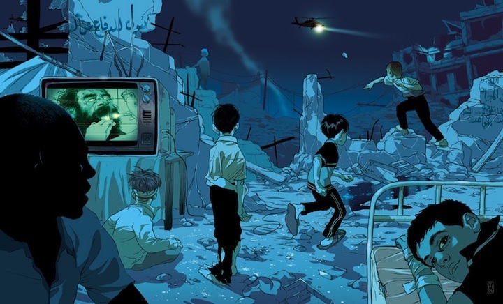 Israeli-born illustrator Tomer Hanuka creates incredibly interesting scenes. His stories are told not just by the expressions on his characters' faces but by the beautiful colors he chooses and the mysterious shadows he casts. His passion for drawing emerged at a young age, when he fell in love with American comic books. He found them “mysterious and majestic, an unreachable light in a faraway land, and more beautiful and exciting than anything around.”