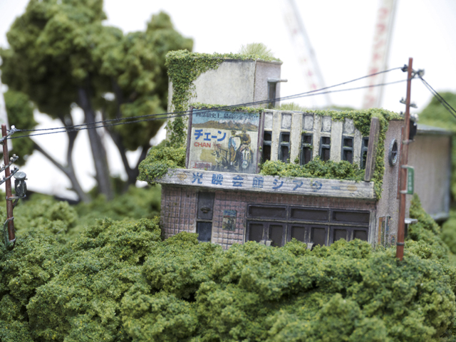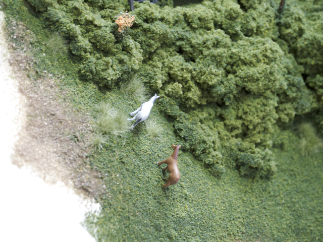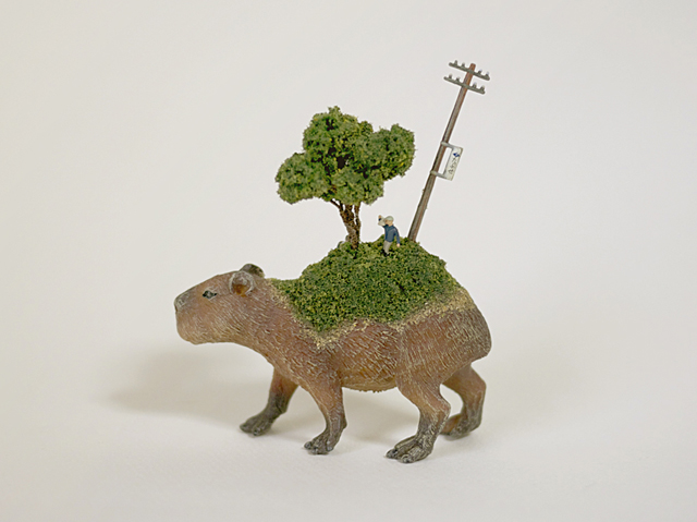 To attach the tiny scenes to the figures, Akiba uses various bonding materials and paints the animals with acrylics. Some dioramas are sparse, with only a single person wandering the deserted land, while others are jam packed with chaotic spectacles. In Akiba's imaginative world, everyone depends on each other to exist in an isolated little universe.