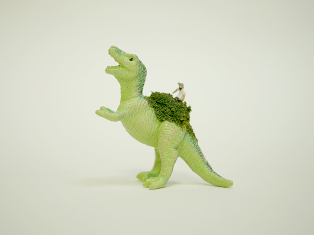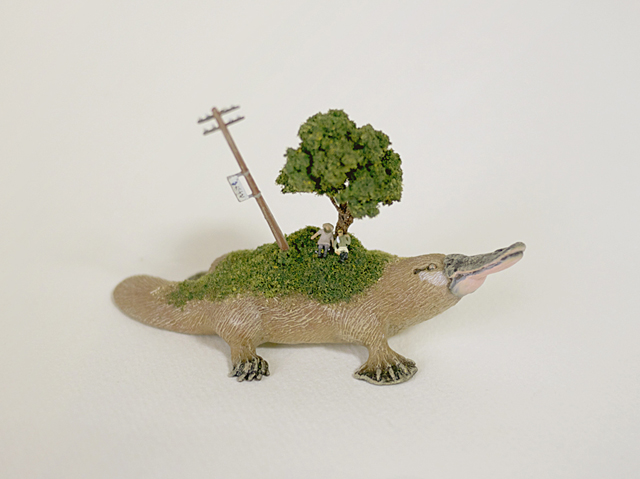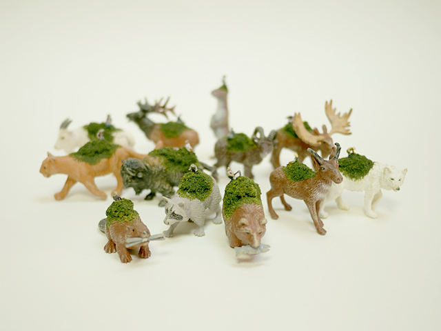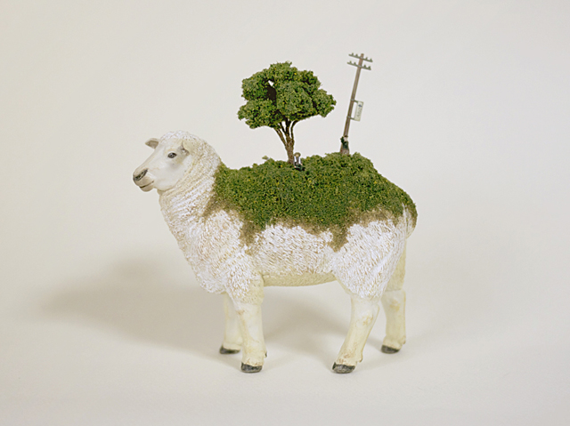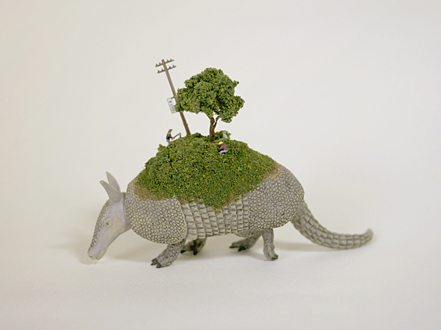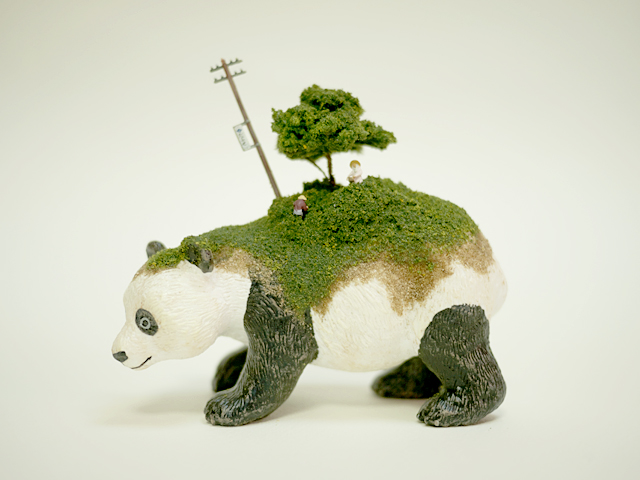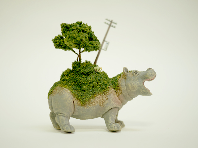 Sekai, Japanese for ‘world', is a series of clever sculptures by Maico Akiba, in which tiny little worlds emerge on the backs of wooden animals. The sculptor and illustrator collects the small figures from Souvenir From Tokyo, the National Museum of Art and Design Tokyo museum shop. She uses miniature trees, cars, people, and even telephone poles to build the detailed scenes on wooden creatures like a panda bear, a hippo, and a turtle, who co-exist with the green landscapes glued to their backs.