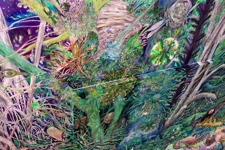 “When drawing a picture, I always think that the picture I am drawing in that moment is merely one part of a larger world and narrative,” the artist says. She compares her feelings to the frustration most of us have felt when we realize that it's impossible to capture an expansive scene or landscape in its entirety using only a camera. Consequently, Ohkojima doesn't stop at the edges of her canvas, but continues to draw and paint on the wall, bringing a larger vista to life. She says, “By drawing like this, the land and the picture are becoming further connected, and one piece of scenery, which I could not see before, is starting to emerge.”