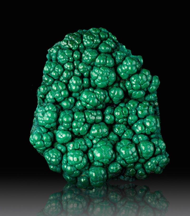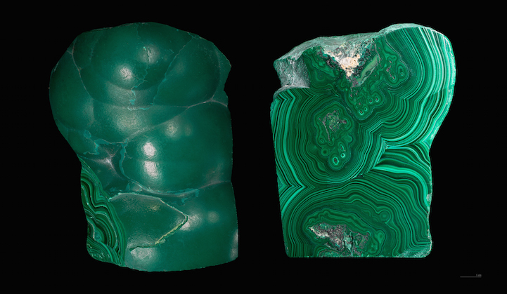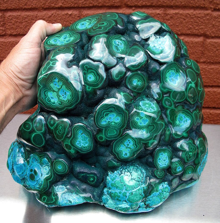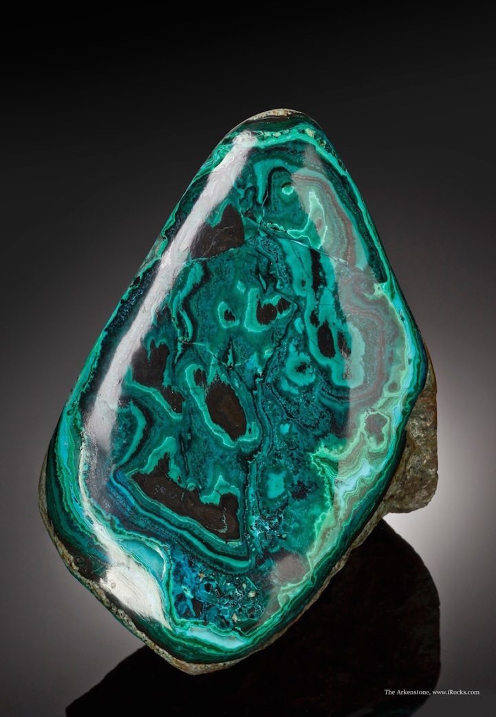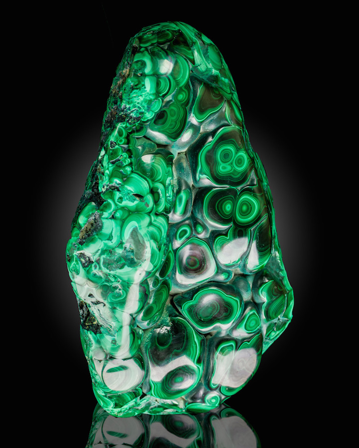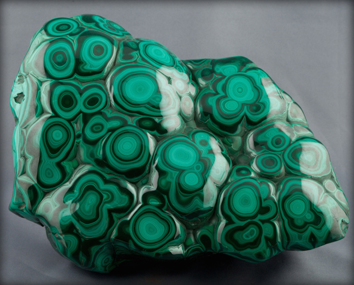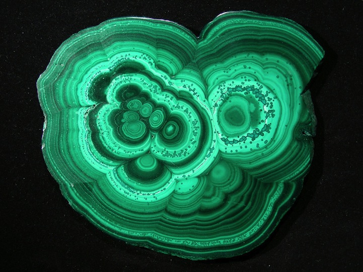 Malachite, which is a copper carbonate hydroxide mineral with the formula Cu2CO3(OH)2, most often forms botryoidal, fibrous, or stalagmitic crystals. What's particularly interesting about this is that, when polished, densely banded specimens reveal vibrant, concentric rings that form hypnotic patterns in all shades of green, from teal to jade to pine. Gleaming under the light, the smooth surface of banded malachite looks more like layered drips of vividly colored paint than a naturally formed substance.
