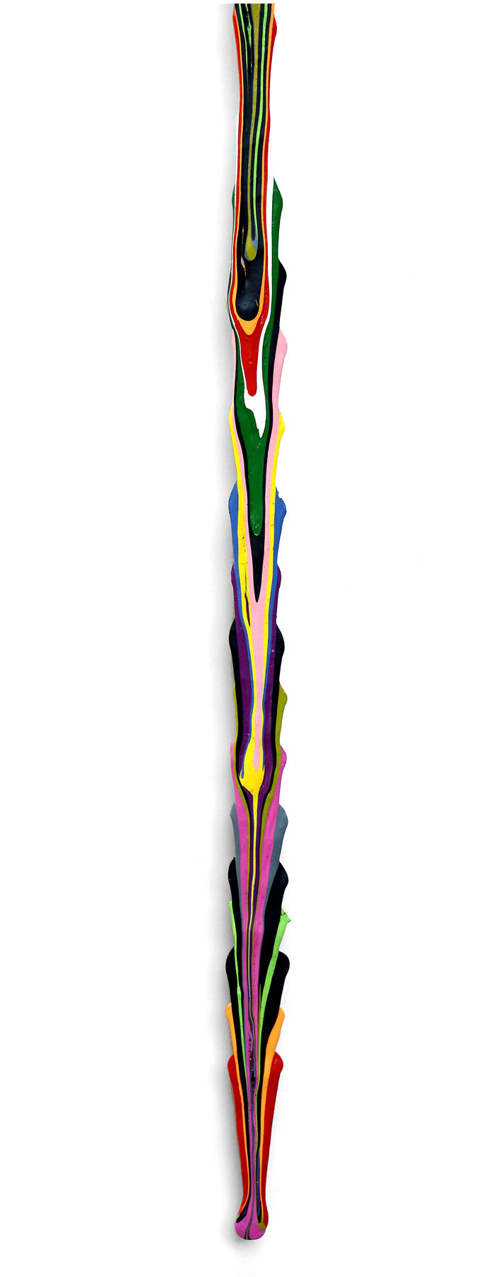 Many of her works feature colorful spills of acrylic splattered across tabletops, dripping over the edge of canvas, and, in this Paint and Air series, suspended from metal armature. The Paint & Air series involves vibrant colors that fall towards the ground in unpredictable, varying lengths, and shine with a glossy finish. Rothschild says, “The way we think about mistakes can play a pivotal role in how we experience life. We miss out on so much potential when we obsess about mistakes in all things. Understanding which things require perfection and when the freedom from worrying about mistakes can greatly enhance our lives is critical.”