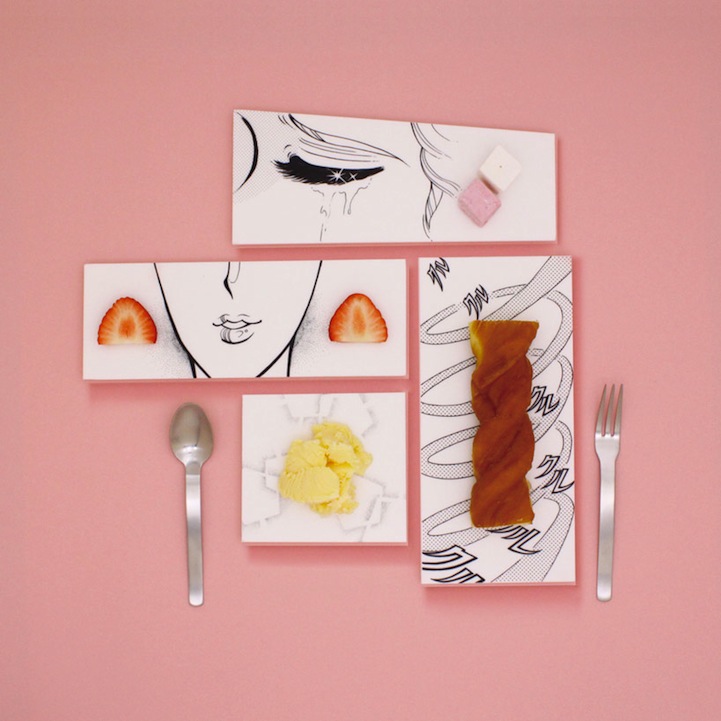 Tsutai, who studies at the Kyoto Institute of Technology in Japan, created these one-of-a-kind designs that feature different black and white drawings, each representing a frame from a manga anime. When the food is arranged in a particular way, it magically becomes a part of the scene! You can even arrange the plates so that they look as if they form a congruent story.