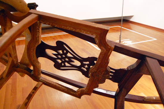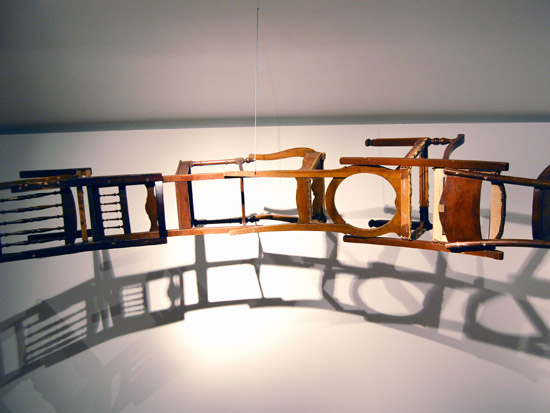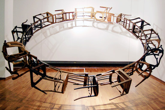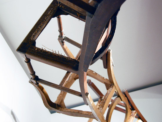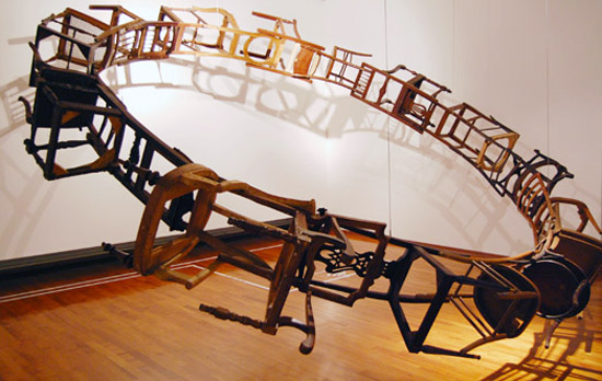 Brooklyn-based artist Marc Andre Robinson uses discarded furniture to create his eye-catching sculptural installations. The artist's piece titled Right of Return (By Themselves and of Themselves) salvages over a dozen chairs and exhibits their assemblage as an infinite loop presented at a slant. Each chair in Robinson's piece is an integral part of the installation.
