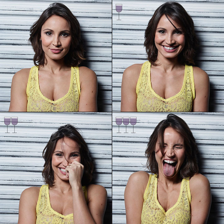 Things can get a bit fuzzy after a few glasses of wine, but Brazilian photographer Marcos Alberti has found a way to clearly conserve and catalog the merrymaking effects of the adored alcoholic beverage. In his latest series called 3 Glasses Later, which began as a joking experiment, Alberti invited friends to his apartment for happy hour and snapped their portraits just as they arrived, when their faces still reflected “the fatigue after working all day long, and from also facing rush hour traffic to get here.” He then captured the way their moods and mannerisms shifted after one, two, and three glasses of wine.