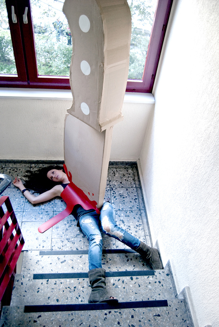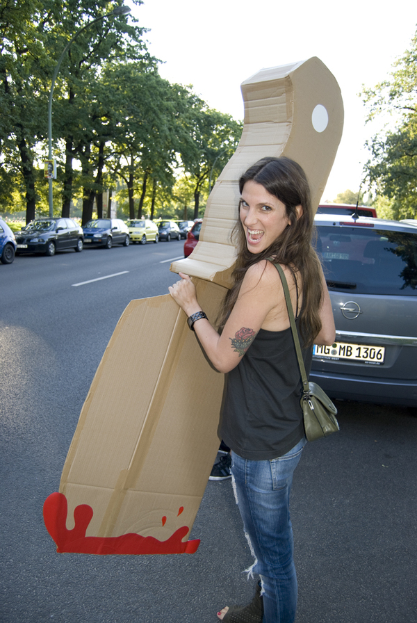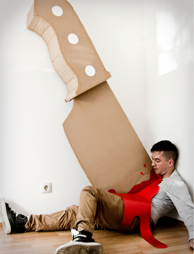 Imagine walking out of your apartment and heading down the stairs, only to come across a person stabbed with a giant cardboard knife lying directly in your path. Shock, confusion, and then comedy would ensue! German-based artist Maria Lujn, along with Wolfgang Krug, can claim responsibility for this hilarious project. The two artists collaborated to create The Knife, a giant detailed sculpture created out of cardboard shapes taped together and red paper that forms the unsettling fake pool of blood.