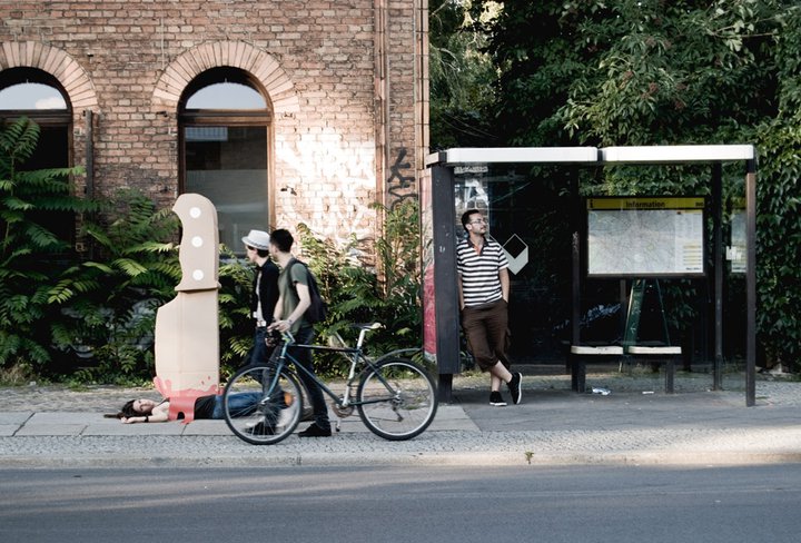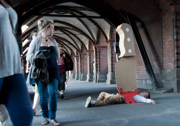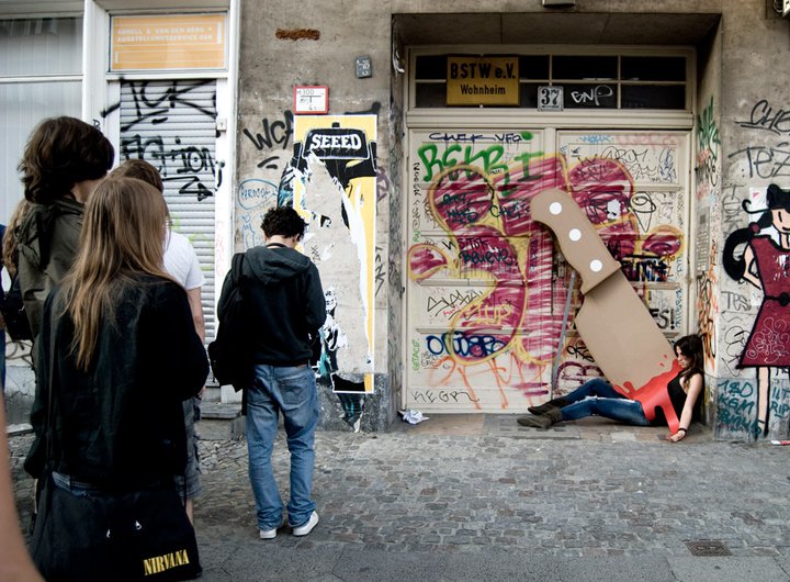 The street installation project involves staging comical public crime scenes, where Lujn or Krug lay in conspicuous spots around the streets of Berlin, assume the position of a recently stabbed victim, and observe what happens as pedestrians stare in utter confusion. The best part about the project is that Lujan describes the project as “Just for the fun of it.” What an unusual yet entertaining way to spend the day: running around town and fake stabbing each other!