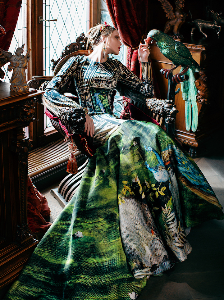 Designer Svetlana Lyalina is the woman behind the fashions seen in Paint Me Over. She is best known for her couture wedding dresses, but she created this special line in collaboration with paintings by Nikas Safronov. Originally worn for a recent 60th birthday of Safronov, they’ve since been immortalized in the exquisite Paint Me Over images, which happen to be shot in his stunning home, among gilded furniture and regal drapery.