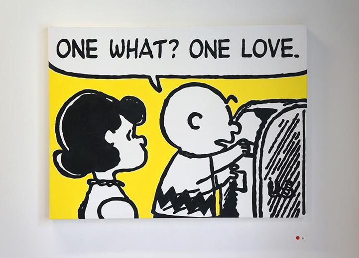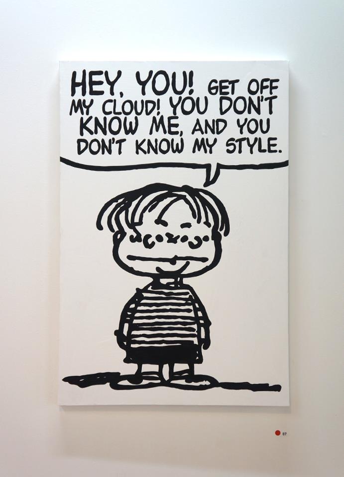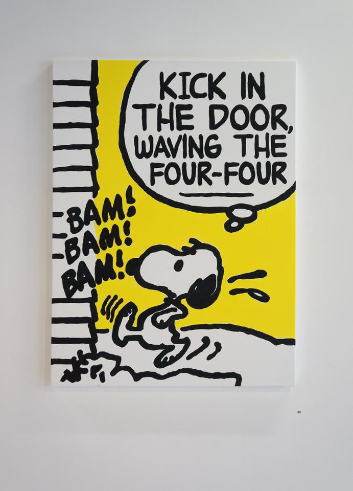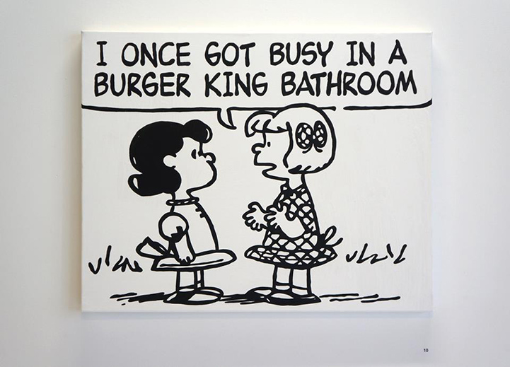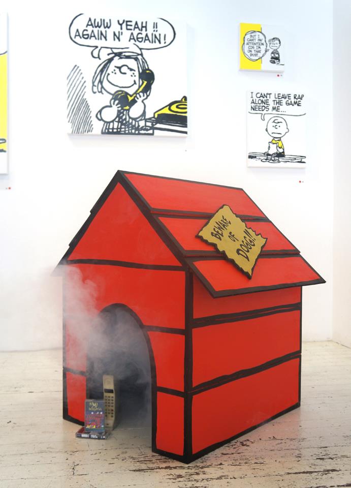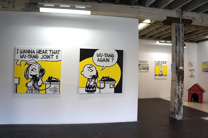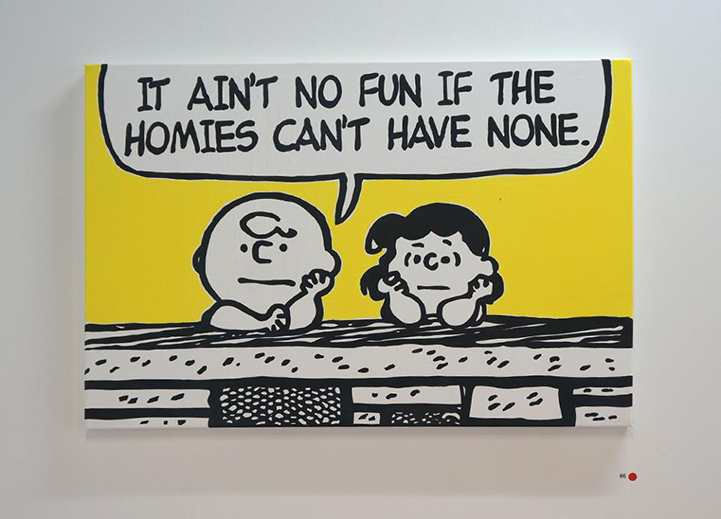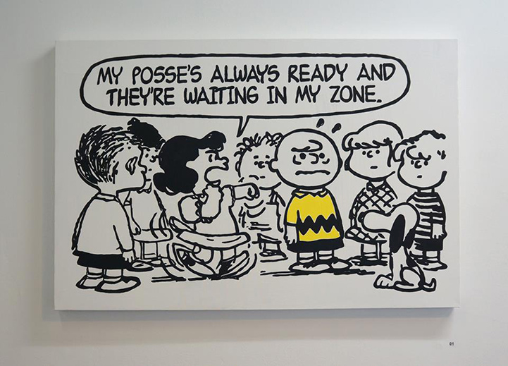 Using lyrics from old school '90's rap, artist Mark Drew created this funny mash-up, entitled Deez Nuts. The Australian-born, Tokyo-based artist painted large-scale scenes from classic Peanuts comic strips, originally by Charles M. Schulz, and then complemented each cartoon with lyrics from songs by Nas, Wu-Tang Clan, Public Enemy, Notorious B.IG., and Digital Underground, among others.