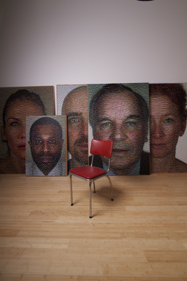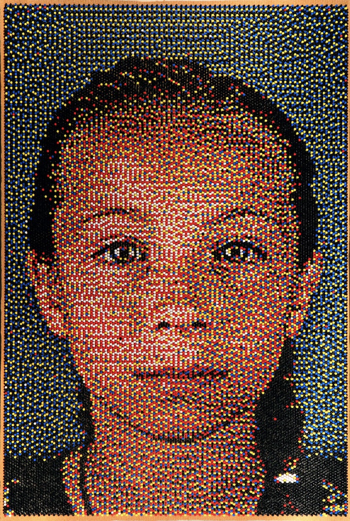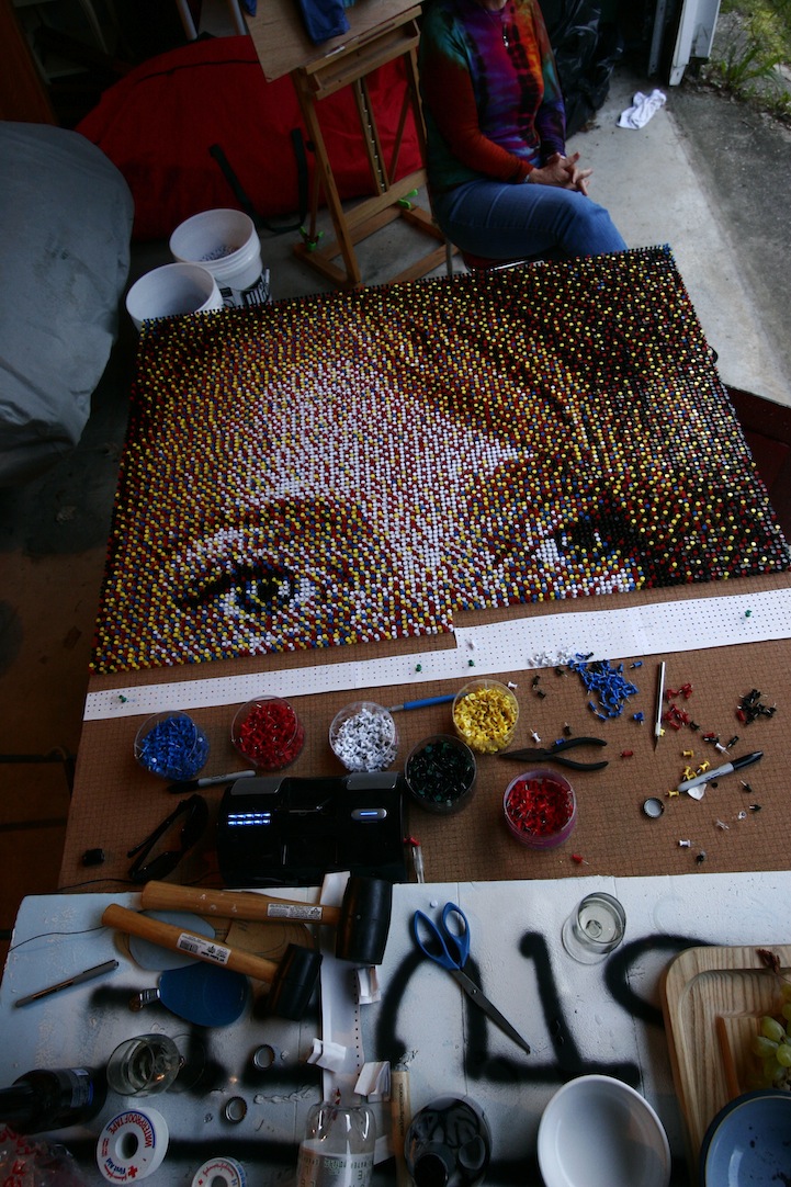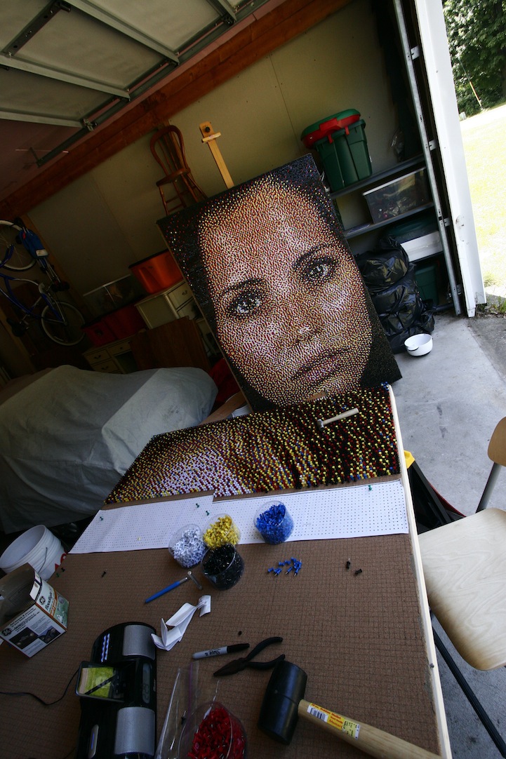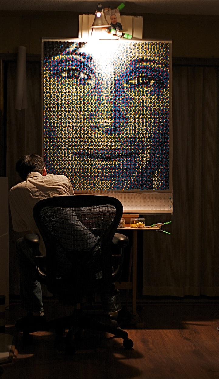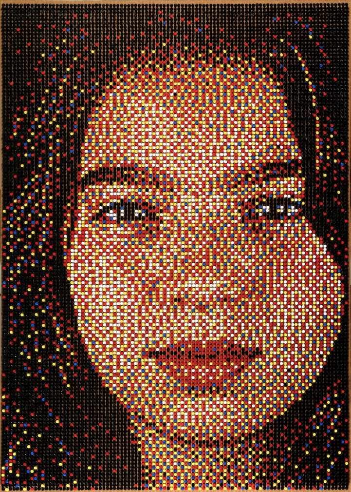 As a process artist, Daigh starts by taking a series of photographs of his subject. After carefully analyzing the photos, he uses a computer and specialized software to break an image down to a very low resolution and forces the computer to make the image out of only five colors (red, blue, yellow, black and white). He then uses a grid map to show where to stick the pins row by row. One can only imagine how much time and patience is required for this kind of artwork.