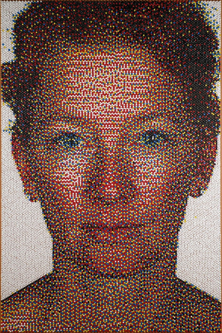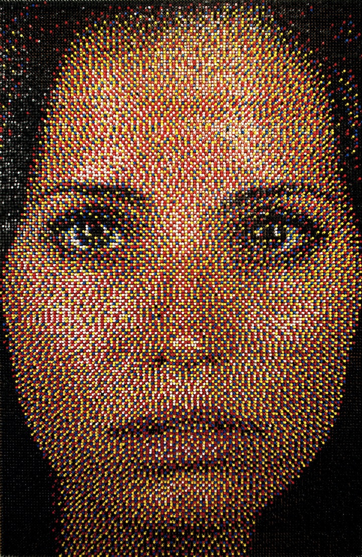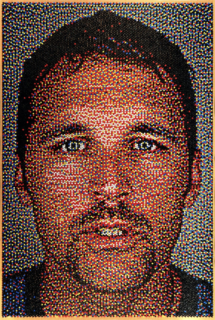 At first glance, Eric Daigh's artwork appears to be a low-resolution portrait, but upon closer inspection, onlookers can see each piece is made up of thousands of colored pins. Combining creativity along with hours of diligent application, the Michigan-based artist uses 25,000 to 100,000 pushpins to create each piece!
