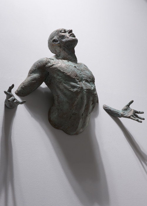 These hard-bodied men emerging from bare, white walls are the works of Milan-based artist Matteo Pugliese. The most apparent and impressive aesthetic choice that Pugliese has chosen in this series entitled Extra Moenia is the decision to present his sculptures in fragments. A bent knee opens the opportunity to represent one whole form in at least two pieces. It is the spectator's mind that makes up the limbs and other body parts that aren't visible. The body movements and configurations are equally intriguing, especially those that are contorted and reflect muscle tension.
