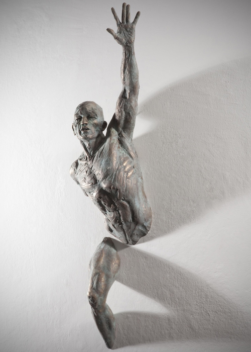 The figurative bronze and silver-plated bronze sculptures represent a strength and struggle, as these warriors burst through the pristine surface. In some cases, it's difficult to tell whether the statues are materializing out of the vertical encasement or actually submerging into a pool of white. Are they breaking free or being engulfed? It's a fascinating thought to ponder. Either way, Pugliese brilliantly exhibits his skilled mastery and understanding of the athletic male form.