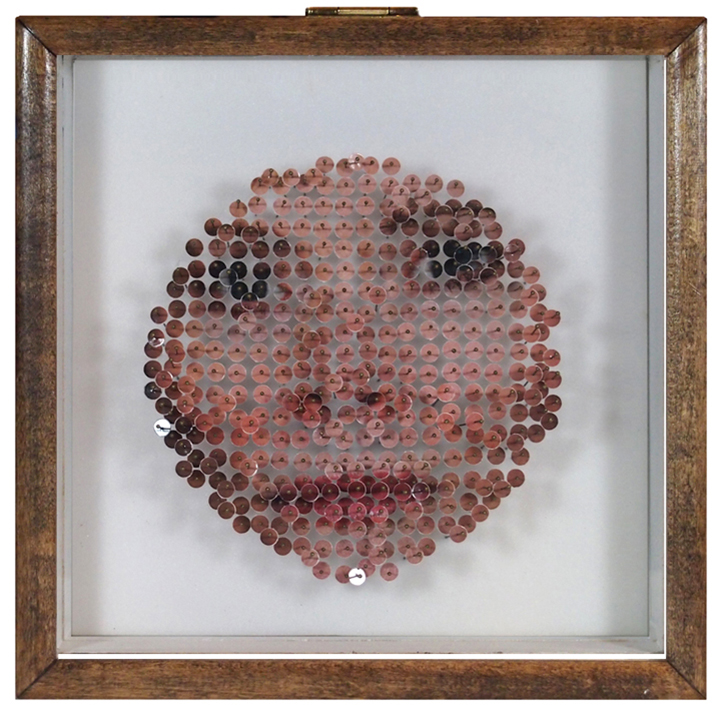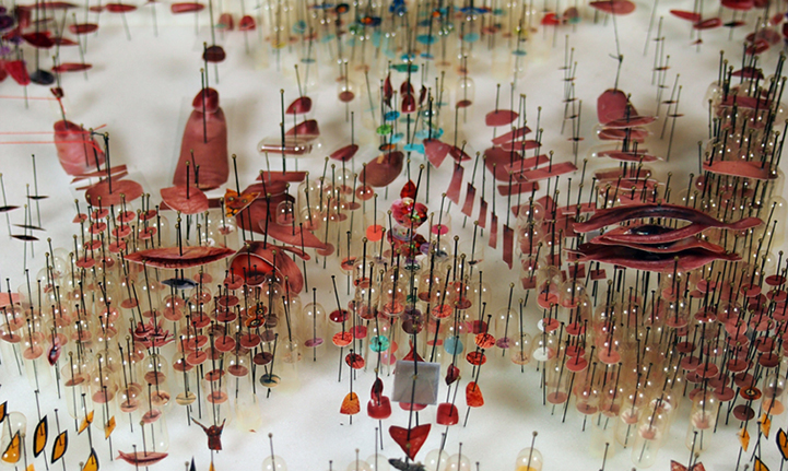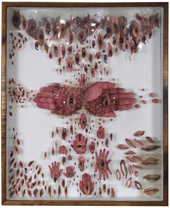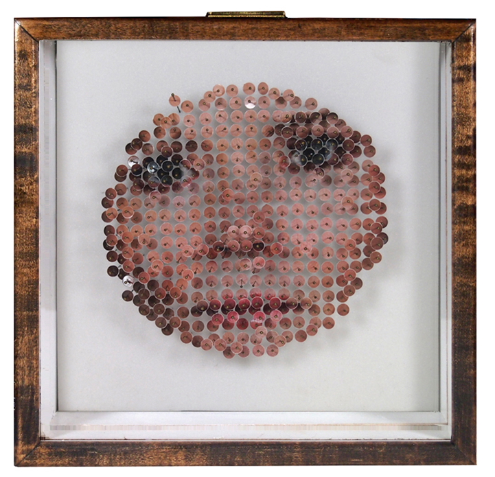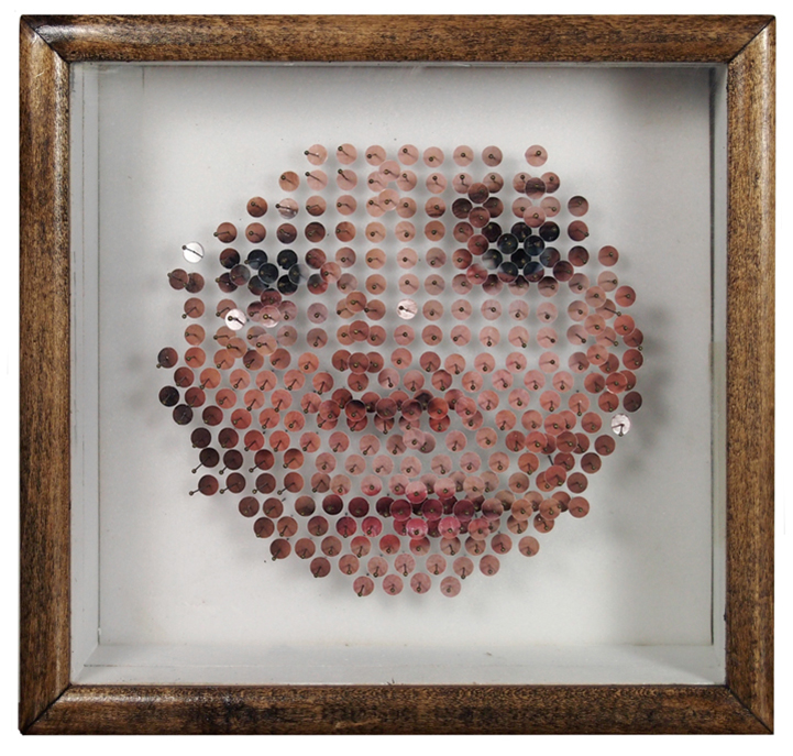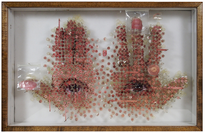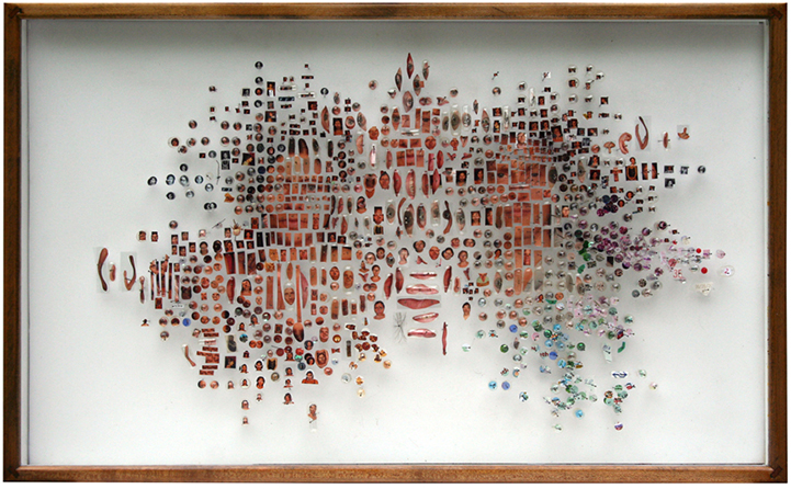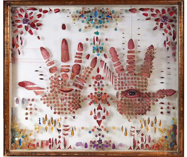 In each composition, he blends a variety of these selected materials with photographic prints, and encases them behind glass and within a wooden frame. He stands pins on end and layers objects together to create a three-dimensional space that is filled with surprises. Beyond the chaos of the chopped up objects, the patterns formed in each collage are extremely symmetrical. Whether Mapes is attempting to convey a pair of hands or a portrait of a friend, the artist has an immense talent for breaking things down and redefining the original as something unexpected and curiously new.