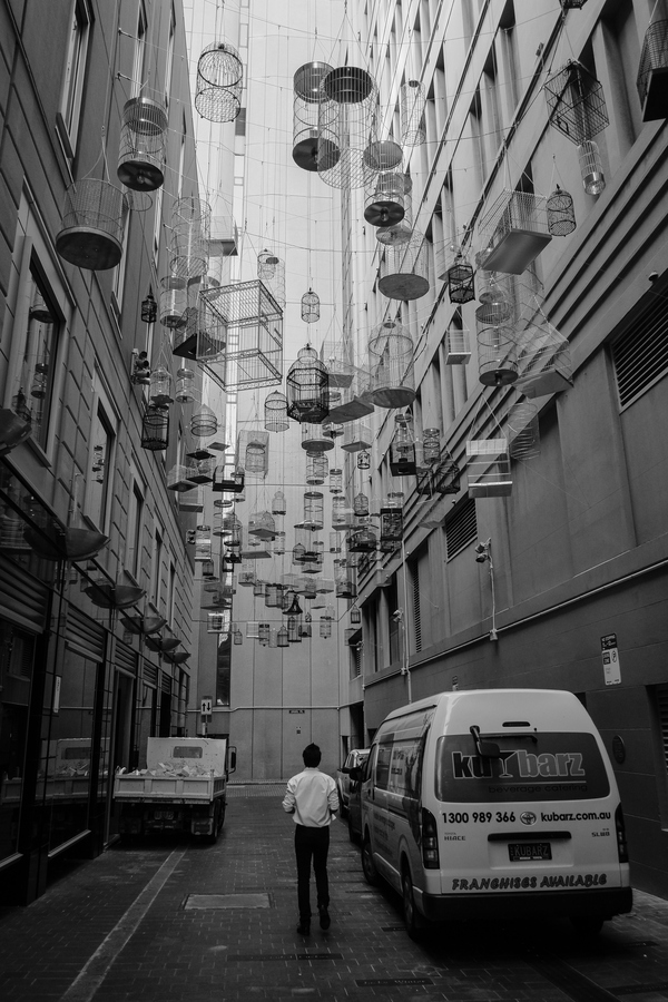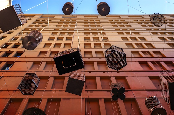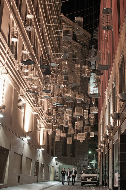 Step into a certain alleyway in Sydney's Angel Place and you'll find a whimsical installation that's meant to be both seen and heard. Back in 2009, artist Michael Thomas Hill created Forgotten Songs, an installation of 110 empty birdcages suspended high in the air that play the songs of fifty birds that once lived in central Sydney before the colonization and urbanization of the area. The sounds of the calls change from day to night with daytime birds' songs disappearing with the sun and nocturnal birds, which inhabited the area, sounding late into the evening.