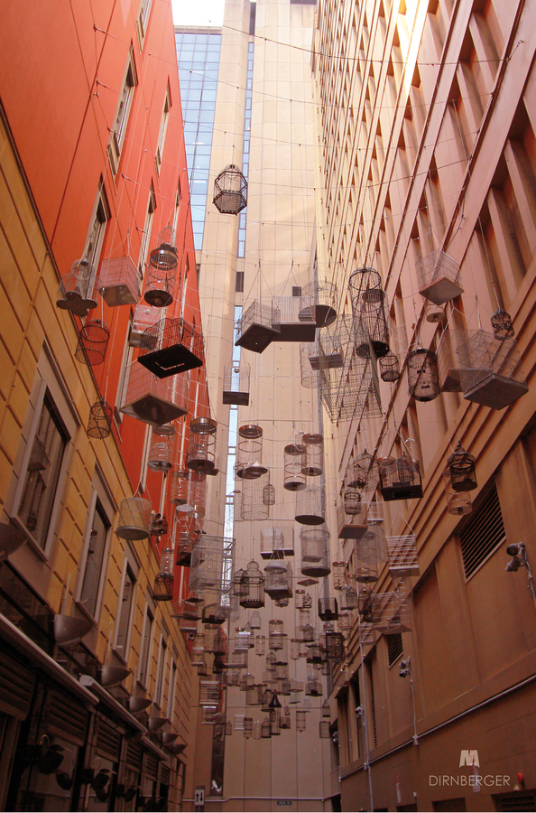 Though first commissioned as part of the City's 2009 temporary laneway art program, the artwork proved to be so popular that visitors and city dwellers requested for it to remain as a permanent public installation. The public outcry led to 180 new rustproof cages to be re-installed with 10 speakers that play the sweet songs of 50 bird species. As a nice touch, the names of the birds that once populated the area are engraved on the paved stones beneath the cages.