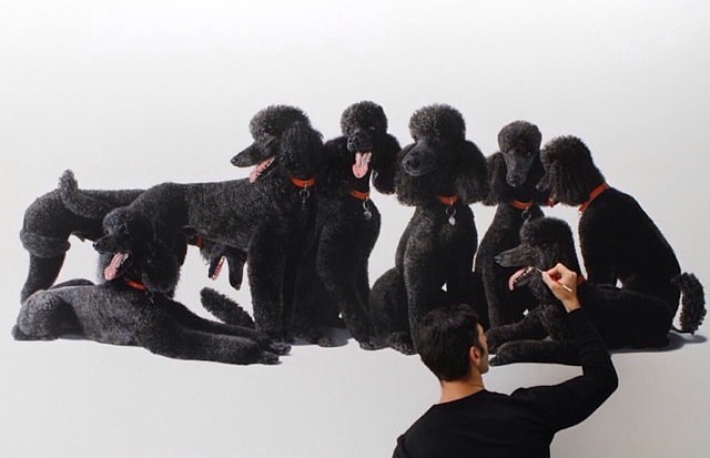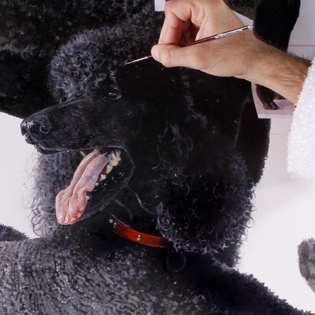 With oil paints and a detail brush in hand, the painter creates short, precise brushstrokes that are barely visible. His technique is especially effective within the detailed paintings of horses and dogs, whose fur appear to blend seamlessly together. When it comes portraying the human figure, the artist flawlessly creates visual harmony in the way he captures the minute glimpses or larger-than-life interplay of light and shadow.