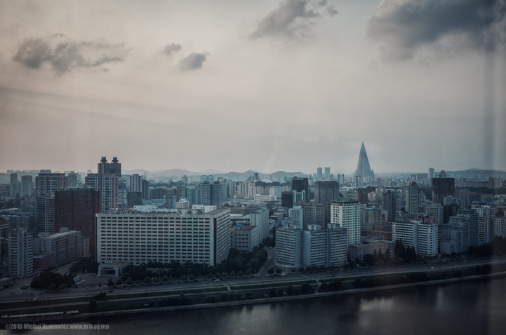 This is what Pyongyang looks like from the Yanggakdo Hotel. On the left, the Koryo hotel, supposedly on fire quite recently. This is where you will stay if you are Chinese – the Chinese are given a lot more freedom than anyone else. The hotel is in the city centre, and the tourists staying there can walk around the block on their own, and get away with crossing the streets (although it's officially not allowed). On the right, the Ryugyong, aka the Hotel of Doom. The 330 m tall buildigs stands largely empty, as North Korea doesn't have the funds to finish its construction (started in 1987).