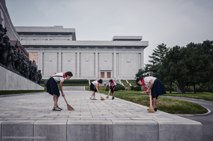 What's the last time you saw a kid in the West cleaning anything? Also, the statue on the left features a North Korean soldier stepping on an American flag.