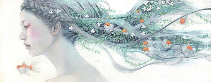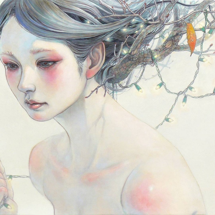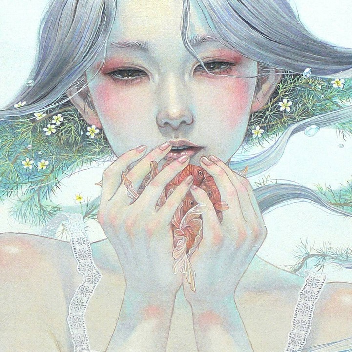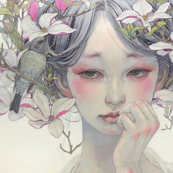 Artist Miho Hirano’s oil paintings communicate a delicate beauty through the use of soft colors and fluid brushstrokes. Featuring ethereal woman and fragments of the natural world, each of Hirano’s paintings emote a melancholic longing that beckons one into her character's striking fantasy-lands. Her paintings show a fairy-tale that has been infused with culturally significant elements and lingering, beautiful figures.