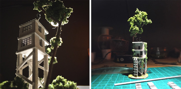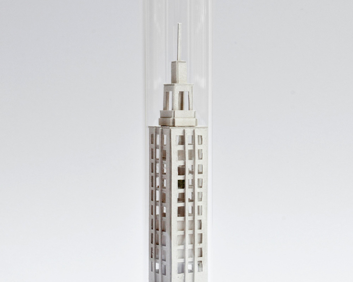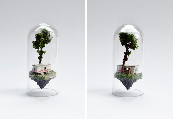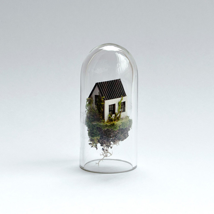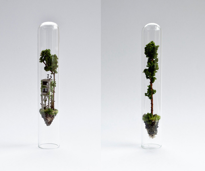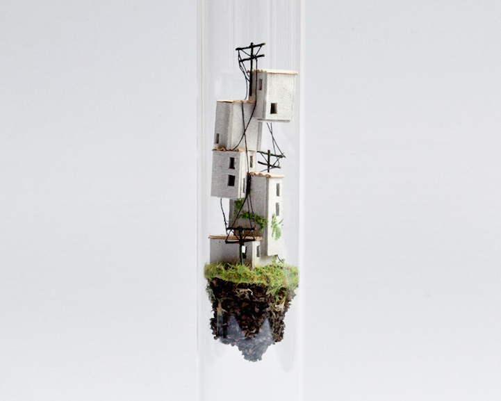 Dutch artist Rosa de Jong constructs worlds inside slender glass test tubes—each complete with micro-sized buildings, teeny tiny trees, and other structures inhabitable by nothing larger than an ant. Comparable to a ship in a bottle, the little houses are made of cardboard while the test tube's environment is made of objects de Jong finds outdoors—sticks brought in by her cat, sand from the Monument Valley, and rocks from the campsites of the Caribbean island of Curacao. At a glance, de Jong's utilization of suspension plays with gravity, so objects appear to float in air effortlessly, growing both upward and downward simultaneously. Her series, titled Micro Matter, considers how small the land we call home really is in comparison to the entire world.