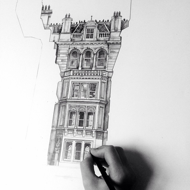 Scotland-based artist Minty Sainsbury meticulously draws buildings that are hidden behind the silhouettes of other structures. Each piece offers an incredible amount of gorgeous detail, and she depicts every brick, window, and decorative facade in a photorealistic style using pencil.