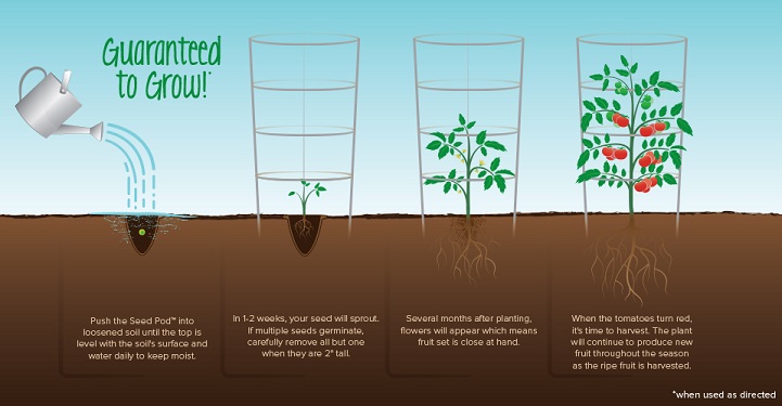 Completely set up and nearly fool-proof, the pods have a pre-established optimal environment to help ensure the growing materials will retain moisture and stay protected. A slow release of plant food gradually delivers nutrients to promote root development, and each container is designed so that the specific plant is placed at the correct depth.