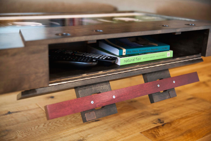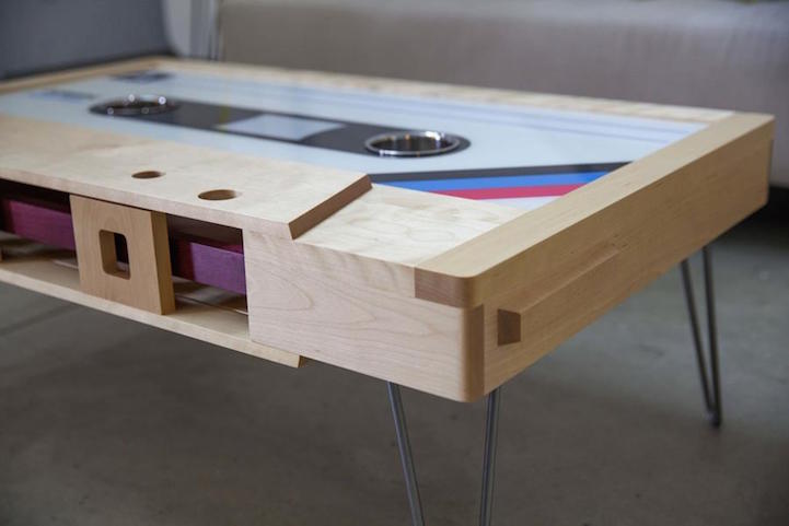 The nostalgia of cassette tapes meets a modern, sleek, and industrial design in Taybles, a Los Angeles-based company which specializes in crafting pop-art that doubles as functional furniture. The three young artists who make up the company (Taylor, Justin, and Zach) produce cassette tape coffee tables, each one made of a mixture of materials—hardwood, birch, steel—and always sealed with clear epoxy. Some models are also fitted with LED lights in the cupholder holes to upgrade any house party.