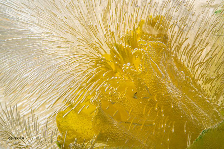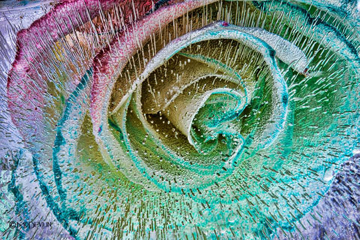 The entire experimental process is delightfully unpredictable. Through trial and error, Devlin has learned that ordinary tap water produces cloudy ice so he now gets his clearest ice by using distilled water. He varies the container size which alters the effects of how the water freezes. And, he uses all kinds of flowers including roses, posies, daffodils, and daisies to obtain a colorful array of painterly compositions.