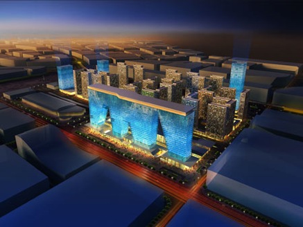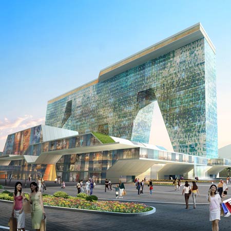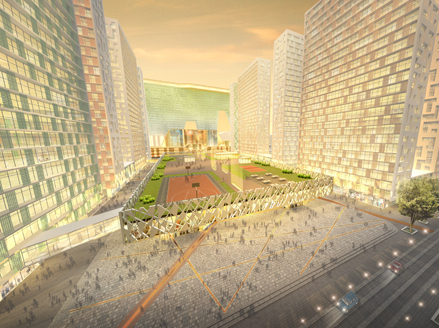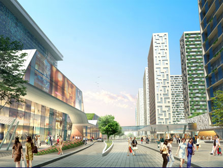 The entrances to the business center will be marked by a number of commercial landmark ensembles. The most prominent is a 1 million square foot (100,000 m2) horizontal building on four legs containing a shopping mall, a skating rink, a cinema, offices, hotel, hotel apartments and loft apartments. The apartment buildings have collective courtyard gardens and shared facilities including two schools and daycare.