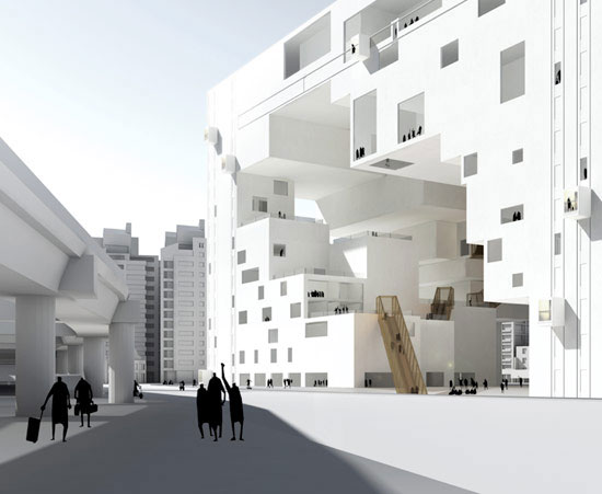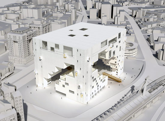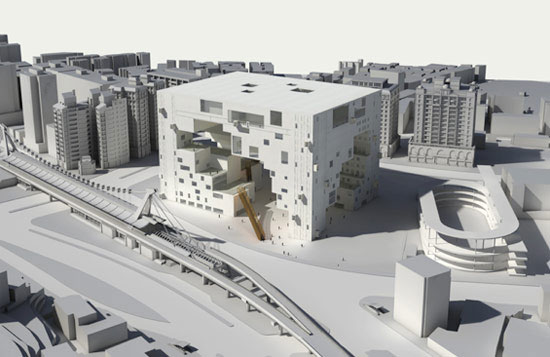 NL Architects proposed this design for the Taipei Performing Arts Center to host a variety of large-scale performances, including dramas and operas. The structure contains three theaters including a 1500-seat Grand Theater, and two 800-seat theaters for repertory performances. With “four legs” that support a “tabletop”, critics praised the aesthetics of the design, but noted two critical issues: the acoustics in such a huge structure would be disastrous, and there would be a lack of sun for several of the cubes. In the end, the Office for Metropolitan Architecture (OMA) won the competition to build the Taipei Performing Arts Center.