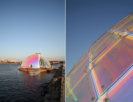 Located on the Han River in Seoul, South Korea, the Floating Stage seems like the perfect place to enjoy an outdoor concert. Designed by Kyungam Architects Associates, the recently completed stage is equipped with LED lights used during laser and water fountain shows.