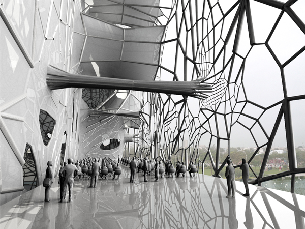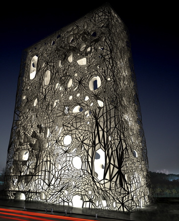 The building sucks up water from the Persian Gulf (the source of the world's saltiest ocean water) through a 3 mile (4.62 km) underground pipeline, and then sprays it over a mesh facade. As the water evaporates and salt deposits aggregate over time, the tower's appearance transforms from a transparent skin to a highly visible white solid plane. The result is a specialized habitat that provides an accessible surface to harvest salt.