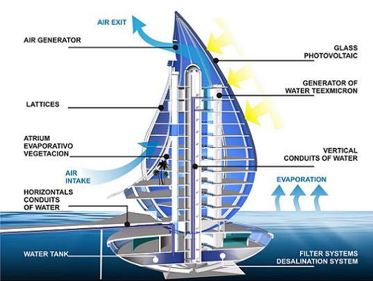 Designed in the shape of a water droplet, the Water Building Resort will be the first building ever to convert air into water, using solar power energy. A sunny, southerly facing facade made of photovoltaic glass will harness solar energy, allowing light to pass through. The northern facade will contain a ventilation system that will convert humid air and condensation into pure drinking water.