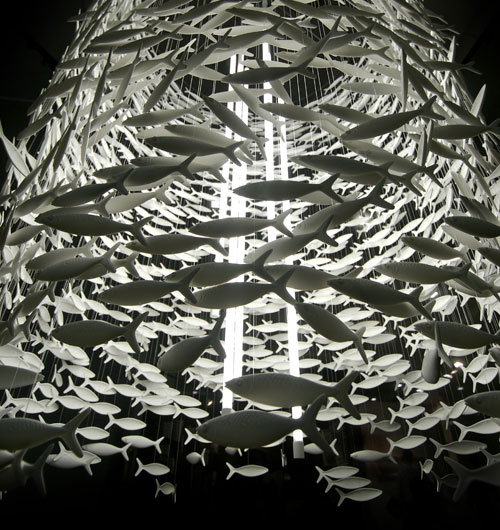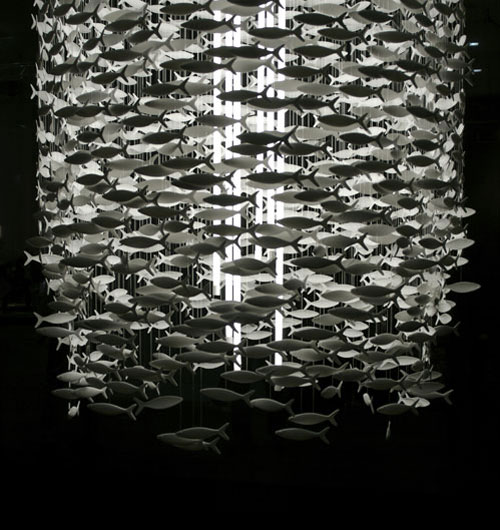 I love the creativity and energy behind Scabetti's ocean inspired “Shoal” light. A mass of fine bone china fish carrying delicate sculpted detail, circle a central beam of light, creating a captivating cylindrical form. Each fish is lit not only by reflected light from its neighbors but also from within, with the light passing through the delicate translucent china body. A very cool alternative to otherwise boring house lamps.