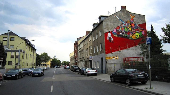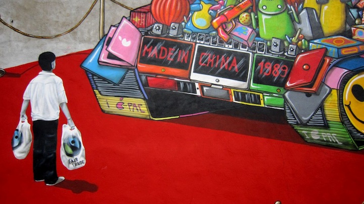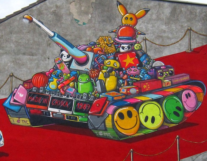 Using iconic imagery from the Tiananmen Square incident in 1989, A.SignL from the Captain Borderline crew recently completed this mural in Cologne, Germany to protest human rights violations in modern China. The tank is made up of all types of cheap consumer goods “Made in China” and the man standing in its way is holding a bag that says “Fair Trade.” The piece was a collaboration with Amnesty International and Color Revolution.