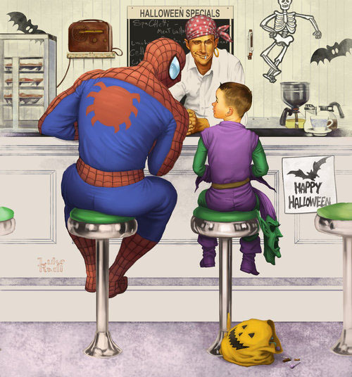 Norman Rockwell's The Runaway has been fantastically remade in Halloween-style by artist Luke Radl. It features Spiderman as the cop, a pirate as the waiter, and a Green Goblin dressed boy as the runaway. Love this modern update. For a quick art history lesson, you can read more about the original Norman Rockwell painting on the Smithsonian website. It appeared on the cover of The Saturday Evening Post on September 20, 1958 (see below).