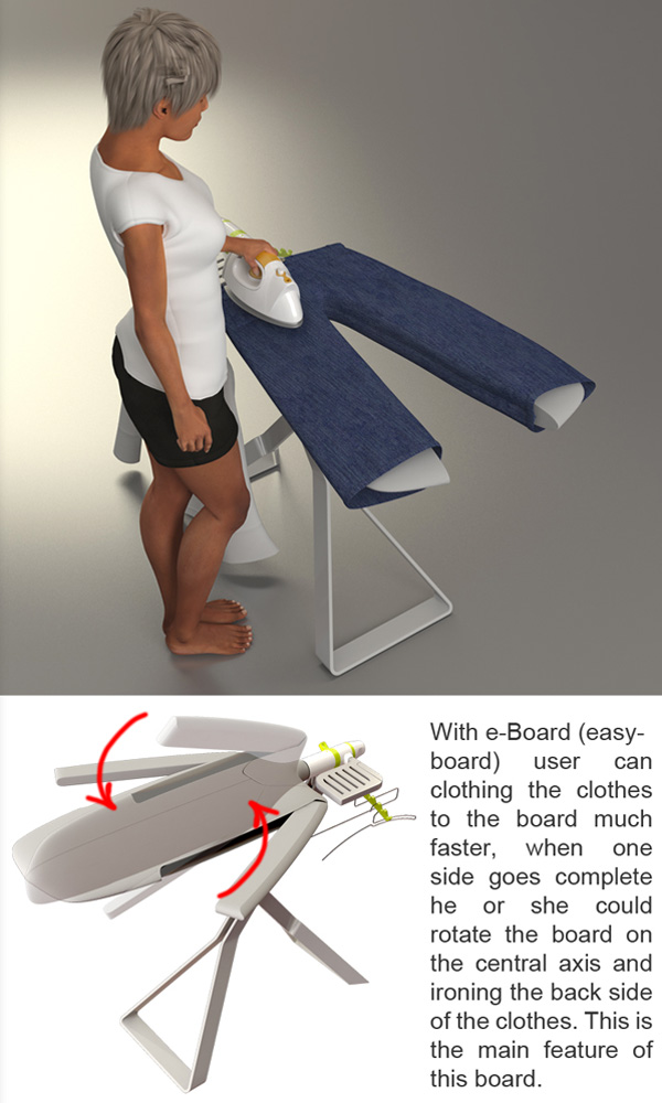 Ironing couldn't get any better than this! The proposed E-board (Easy Board) concept, by designer Mohsen Jafari Malek, could possibly make the chore of ironing a bit easier. No more fumbling around to press out the wrinkles of one pant leg, as the other pant leg hangs clumsily off of the side.