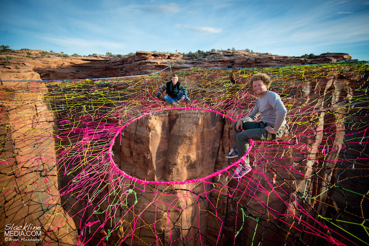 The Mothership was the brainchild of Andy Lewis, and it took more than 50 people over a three day period to install it. “This was without a doubt one of the most unique Thanksgiving gatherings we've had out here in the Moab desert,” photographer Brian Mosbaugh writes on the Slackline Media website. No one was injured while performing these dangerous stunts, and the project established new relationships by bringing the community of athletes and supporters closer together.
